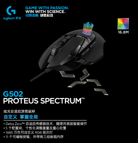 这款罗技 G502 游戏鼠标自适应传感器技术,随使用表面只能调节,5个配重块,个性化调整重量及重心位置,1680万色可自定义EGB指示灯,11个可编程按键,并带有三组板载内存。