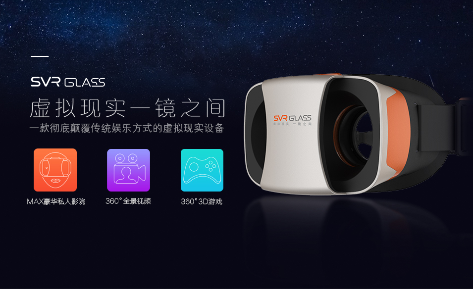 SVR GLASS需要配合手机使用的沉浸式虚拟现实眼镜。时尚的外观,优秀的光学设计,双眼近视度数独立可调。 可随时观看2D/3D大片、 360°全景视频,畅玩360°3D游戏,搭配蓝牙遥控器操控更便捷。 智能APP包含海量游戏和视频资源,体验出色。